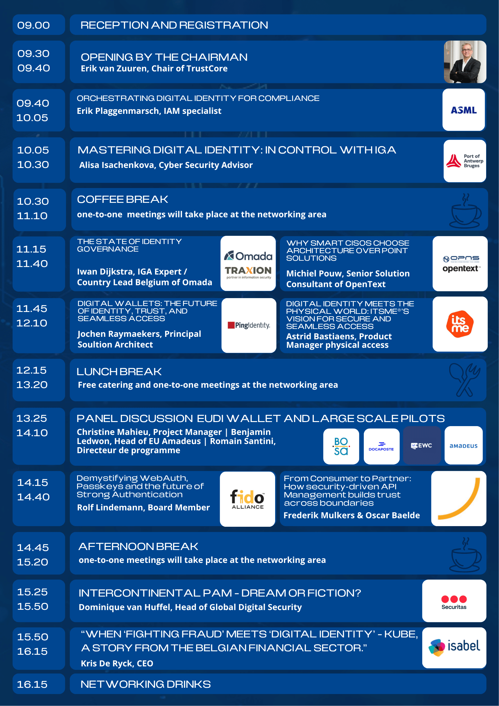 Meet registered peers and solution providers from, among others, Deutsche Bank Belgium, Belfius Bank, Fluvius, OMP Belgium, Ping Identity, Port of Antwerp- Bruges, ASML, Okta, TUC Rail, UCB Biopharma, YPTO, SITS Traxion, Upright Security, Securitas, Isabel Group, Itsme, OPNS, Opentext, Omada, Docaposte, Amadeus, EWC, FIDO Alliance, Trend Micro & more.