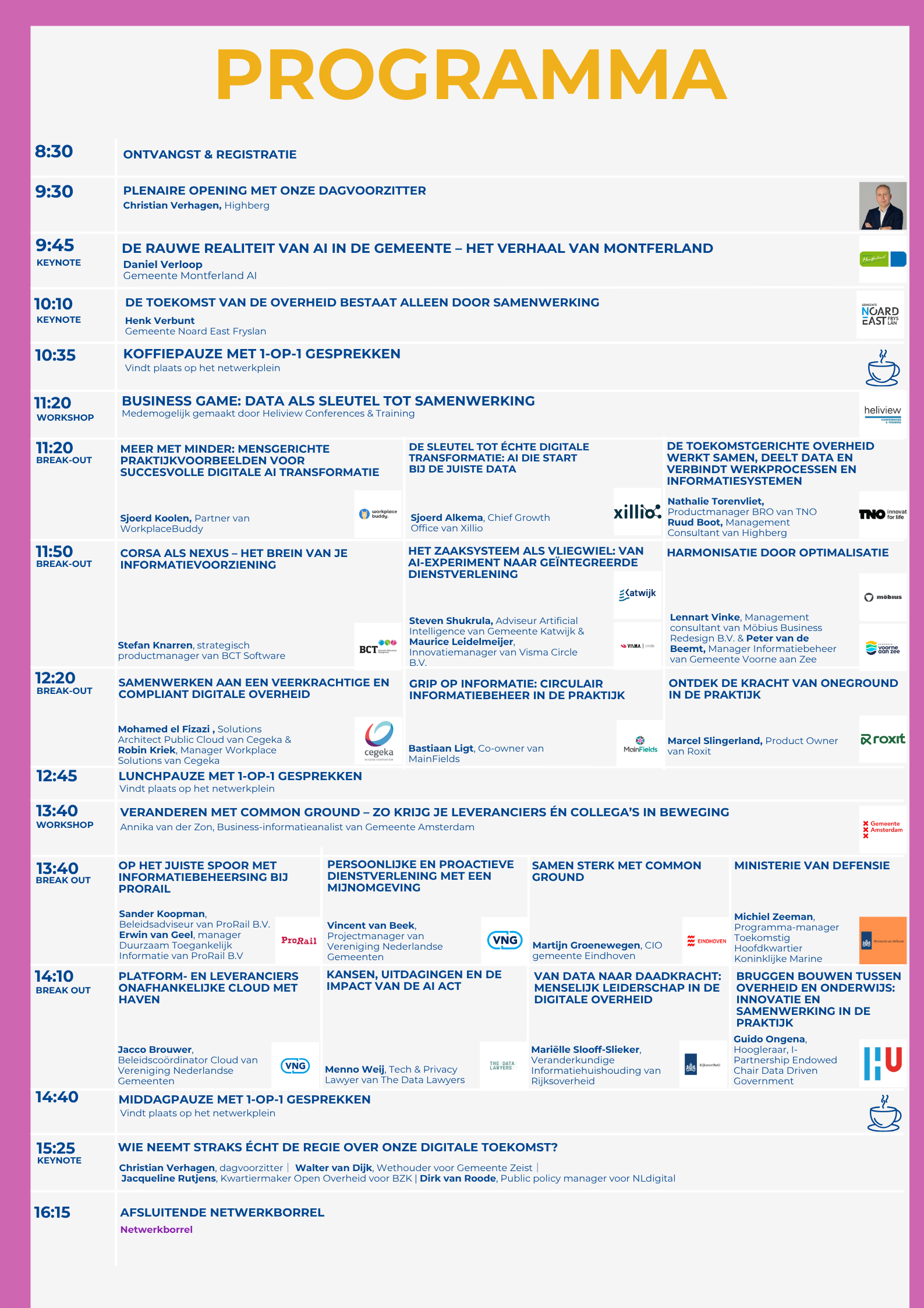 Het programma zal starten om 9:30 uur en eindigt met een netwerkborrel om 16:30 uur.
